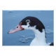 Retrato de un hermoso pato blanco y negro con ojos inusuales.