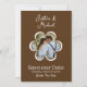 Este Anuncio de Boda personalizado presenta un tema retro inspirado en los años 70. El fondo es de color marrón chocolate, con texto marrón y los nombres de la pareja impresos en una elegante fuente de escritura. Una flor estilo años 70 blanca y marrón se imprime en el centro. Una foto de muestra se coloca dentro del marco de la flor que se puede personalizar para incluir su propia foto personalizada u otra imagen.