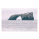 Un gran arco de roca natural se alza majestuosamente en medio de un océano tranquilo. El arco está formado por una gran roca gris oscura con una abertura natural, creando una arcada perfecta. La roca está recubierta de musgo y liquen verde claro, lo que le da un toque de color al paisaje, por lo demás gris. El cielo es un gris pálido, lo que sugiere un día nublado.