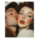 Un retrato de inspiración retro capta el momento de un beso tierno entre un hombre y una mujer. La iluminación tenue y la paleta de colores vintage evocan una sensación de nostalgia, con el impresionante maquillaje de la mujer y los ojos cerrados del hombre realzando el ambiente romántico.