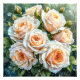 Hermoso arreglo de rosas melocotón pálido, exuberantes y vibrantes, adornadas con gotas de agua brillantes que descansan sobre sus delicados pétalos. Cada rosa está intrincadamente detallada, revelando capas suaves y texturas intrincadas. El arreglo se complementa con hojas verdes frescas y capullos en ascenso, creando una apariencia armoniosa y natural. El fondo es una mezcla suave de verdes, que realza los tonos suaves de las rosas, dando a la imagen una atmósfera fresca y serena. Las gotas añaden un toque de elegancia, sugiriendo una lluvia reciente o rocío, resaltando la belleza de las flores.