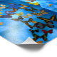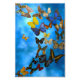 Muchas mariposas coloridas vuelan juntas sobre un suave fondo azul de nubes en una curva.
