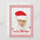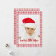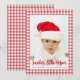 Dentro de un cuadro de cuadros rojos y blancos, hay una foto de un bebé con un sombrero rojo de Santa, sobre fondo blanco. En la parte inferior, las palabras "Ayudante de Santa" están escritas en una letra roja grande, y el resto del mensaje en letras rojas pequeñas mayúsculas.