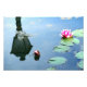 Foto einer Wasserlilie und einer Knospe mit einem überraschenden Spiegelbild im Wasser einer Laterne.