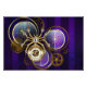 Araña de acero de oro y acero con relojes antiguos decorados con artes dorados sobre el fondo morado, rayado, texturado con lentes y engranajes de latón. Estilo Steampunk.