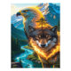 - Below, a **wolf with glowing amber eyes** radiates strength and primal energy. Flames encircle its neck and chest, forming a fiery pattern that conveys elemental power.