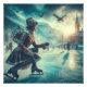 This elegant winter messenger travels along the ice on ice skates in this steampunk Victorian fantasy world towers a tower in this detailed fantasy artwork.