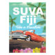 Suva, poster de vacaciones vintage de Fiji. Afiche de Suva Classic para viajes en automóvil. Un coche clásico.