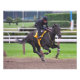 Este caballo de carreras marrón oscuro respiraba el día de la apertura en Saratoga con su entrenador. Siente el poder y la emoción en esta emocionante foto de caballo y jinete mientras las cuatro cascos salen del suelo. Fleetto