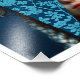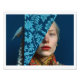 postal de vacaciones de invierno nórdica/escandinavia, mujer rubia con labios rojos, patrones florales azules, diptych con un pájaro de invierno. Trato tradicional, vestido. Noruega, Suecia, Finlandia, Minnesota, Wisconsin.