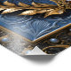 Esta obra de arte en 3D imita la artesanía de un metalero de orfebre especializado en oro, plata y otros metales preciosos. Presenta un retrato de tigre 3D en tonos oro y plata metálicos, ambientado con un fondo de hojas de estilo barroco muy detalladas. La obra se imprime para capturar las texturas ricas de los efectos visuales de los elementos metálicos.