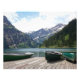 Beautiful, tranquil photograph of an Alpine lake with boats and lush green mountains in the background.