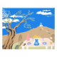 Original hand drawn illustration of Mediterranean afternoon with wine and coffee scenery, travel keepsake decor for backpackers. travelers and slow living lovers. Homely scenery with table set under an olive tree with a small chapel on a hill in the background on a sunny day with blue sky. Great as a kitchen decor.