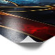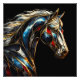 Retrato lateral de un caballo impresionante de estilo abstracto. Esta obra de arte presenta una técnica artística de vidrio manchado con líneas doradas, llenas de vibrantes tonos rojos, azules, naranjas, negros y plateados sobre un fondo oscuro. El resultado es una majestuosa representación de un stallión que exuda esplendor regal.