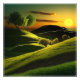 Esta obra de arte mientras el sol se pone sobre el horizonte, lanzando un cálido naranja resplandece a través del cielo, atrapando el viento y fluyendo a través de los árboles en las verdes colinas de abajo.