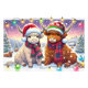 Este encantador ilustracion de estilo manga presenta dos vacas de la región montañosa, una grande y una pequeña, vestidas con gorras y bufandas de invierno festivos. Ubicados en un paisaje de nieve, están rodeados de coloridas luces Navidades y decoraciones de vacaciones, creando un ambiente acogedor y acogedor para las vacaciones. Ideal para la decoración Navidad, esta obra de arte capta el espíritu de la temporada con un toque único de vaca de la región.