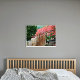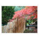 Imagen fotográfica que muestra la imagen fotográfica de una rama de hojas rojas japonesas de arce colgando sobre una cerca ornamental de bambú en un jardín japonés. Personalizar el tamaño de impresión que desee. Foto: Parque de la Defiance en el Jardín Japonés.