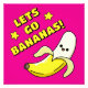 Adorable pegatina que presenta un adorable dibujo animado, plátano amarillo kawaii feliz con las sonrisas más dulces, ojos grandes redondos y medio pelado. Encima de él en letras amarillas con una sombra negra que dice '¡Vamos a Volvernos Locos!'. Dos estrellas amarillas brillantes están a ambos lados de las palabras.