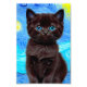 Foto impresa con un gato negro en la pintura de Van Gogh Starry Night! Este gatito de ojos azules mira adorablemente desde un fondo de remolinos azules y una brillante luna amarilla. ¡Un regalo fantástico para los amantes del gato y para los coleccionistas holandeses de arte!