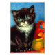 Foto impresa con un hermoso gato de Van Gogh tuxedo! Este pequeño gatito se encuentra junto a una cesta de flores naranjas sobre una mesa roja. ¡Un gran regalo para los amantes del gato y para los coleccionistas holandeses de arte!