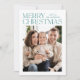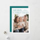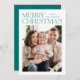 Tarjeta fotográfica navideña moderna con "Feliz Navidad" mostrada en la parte superior del diseño con letras verde azuladas de moda con un fondo blanco. Personalice la tarjeta de Navidades simples con su nombre y foto de familia. La tarjeta se invierte para mostrar un fondo verde azulado con puntos blancos sutiles (nieve).