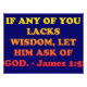 SI ALGUIEN DE USTEDES CARECE DE SABIDURÍA, QUE LE PREGUNTE A DIOS. Del Comentario de Clarke: James 1:5. Si alguno de vosotros carece de sabiduría, la sabiduría significa en general el conocimiento del mejor fin, y el mejor medio para alcanzarlo; pero en las Escrituras significa lo mismo que la verdadera religión, el profundo conocimiento práctico de Dios, de uno mismo y de un Salvador. Que pregunte a Dios - Porque Dios es el único profesor de esta sabiduría. ¡Ordene su copia de la foto impresa con esta hermosa imagen de la Biblia hoy!