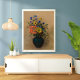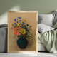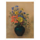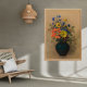 Una vida animada y tranquila con un ramo de flores colorido en un jarrón azul oscuro. El conjunto incluye geranios de color rojo intenso, margaritas amarillas soleadas y cornflores azules alegres, lo que crea una composición armoniosa y animada. Los colores pastel y los tonos suaves le dan una calidad delicada e impresionista a la pieza.