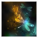 Vuelo de libélula resplandeciente, verde, dibujada de forma artística, con alas transparentes, verdes y amarillas sobre un brillante fondo nocturno con plantas de pantano y luciérnagas. Flauta de dragón resplandeciente.