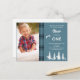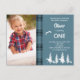 Delante: Una invitación a una fiesta con tema de leñador gris azul para el fiesta de primer cumpleaños de un niño. ¡Inserta tu foto vertical del chico de cumpleaños! Plantillas para el nombre, edad 1 y detalles del fiesta. Modalidades de franela azul y negra de malla, silvestres silvestres y silvestres en blanco. Árboles, alce, rabitez, zorro y águila. Letras blancas.