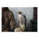 Foto de un halcón con los ojos vendados que se usa para la cetrería en el zapato de un halcón en Doha, la capital del país del Golfo, Qatar.