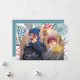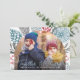 Tarjeta de Navidad con marco de arco moderno con tu foto favorita y verdor invernal. Juntos y Feliz en caligrafía script y el nombre de la familia en tipografía serif clásica.