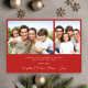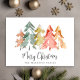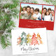 Elegante tarjeta de vacaciones con un resumen acuarela de pinos en naranja verde sabio, rojo, dorado y quemado y "Feliz Navidad" en un guión elegante. En la parte posterior, agregue dos fotos, un saludo estacional personalizado y sus nombres en un guión tipo firma.