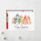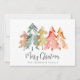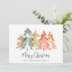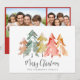 Elegante tarjeta de vacaciones con un resumen acuarela de pinos en naranja verde sabio, rojo, dorado y quemado y "Feliz Navidad" en un guión elegante. En la parte posterior, agregue dos fotos, un saludo estacional personalizado y sus nombres en un guión tipo firma.