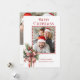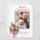 Diseño divertido y festivo con una plantilla fotográfica en un marco de bastón de caramelo con un ramo de hueso invernal y vegetación atado con un arco a rayas de caña de caramelo. Presenta el saludo de Feliz Navidad con un tipo de letra personalizado único. En la parte posterior se muestra una plantilla de foto adicional.