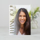 Celebra tu graduación con estilo con nuestra tarjeta de agradecimiento de graduación con lámina dorada elegante, una forma elegante y sincera de expresar tu gratitud. Esta tarjeta personalizable presenta un diseño limpio y contemporáneo con espacio para tus fotos favoritas en la parte delantera y trasera, perfecto para mostrar tus retratos de último año y momentos memorables de graduación. Personaliza el texto para hacer que tu mensaje sea verdaderamente tuyo, ya sea que estés agradeciendo a amigos, familiares o mentores por su apoyo.