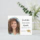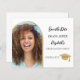 Foto Guardar la tarjeta de fecha para una fiesta de graduación. Al frente: Añade tu propia foto vertical del graduado. Un marco falso de fotos en oro. Fondo blanco de moda, texto negro. Plantillas para un nombre y una fecha. El nombre y el texto: Guardar la fecha se escriben con un guión de estilo con letras a mano moderno. Con una gorra, con una tapadera. Atrás: detalles del fiesta. 1 hoja = 1 Guardar el borde impreso de fecha en borde.