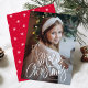 Tarjeta fotográfica de vacaciones con "Feliz Navidad" incluida en la parte inferior de la tarjeta en un guión escrito a mano en blanco. Personaliza la tarjeta de Navidades caprichosos con tu foto vertical y tu apellido. La tarjeta se revierte a un patrón de copos de nieve rojos y blancos.