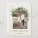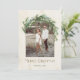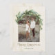Este elegante diseño de tarjeta de vacaciones cuenta con un marco único en arco para su foto con verduras de pino de vacaciones, vegetación eucaliptos y luces de hadas de cuerdas que caen en cascada para acentuar su imagen. Incluye el texto de color bronce "Feliz Navidad" con una redacción que puede ser personalizada y un fondo de marfil neutro y color crema de color acuarela.