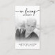 Tarjeta de plegaria de memoria para amantes de la fotografía funeraria moderna. Mantenga la memoria de un ser querido cerca con esta tarjeta de oración personalizada personalizado que incluye una foto atesorada, el título EN MEMORIA DE AMOR, nombre y fechas y un mensaje de recuerdo sentido editable. Con su sencillo pero elegante diseño clásico en blanco y negro y su escritura moderna con toques, hace un gran placer para compartir en un funeral, servicio conmemorativo o celebración de la vida y ofrece confort y un homenaje duradero para la familia y amigos. Su tamaño pequeño y portátil de 3,5x2" (tamaño de cartera) hace que sea conveniente para los seres queridos llevarlo con ellos como recordatorio de la vida y el espíritu de su ser querido. La personalización hace que cada tarjeta sea única. NOTA: Si subes una foto en color y la quieres en blanco y negro, ve a FILTERS en EDIT y selecciona Blanco y negro.)