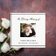 Un libro de invitados para un funeral o funeral. Fondo blanco, marco negro en la parte delantera. Personalice y agregue una foto, nombre y fechas. Texto negro.