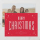 Una tarjeta de Navidad grande, audaz, simple y sin complicaciones. Perfecta para uso personal o corporativo. Con un saludo navideño en una fuente retro rodeada de estrellas estilizadas y detalles personalizados editables debajo. Simplemente cambie su propia foto en el reverso. También disponible en otros colores, con un mensaje impreso en el reverso en lugar de una foto, como un diseño de estampado en foil y como tarjetas plegables.