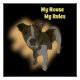 La imagen es un pequeño Fox Terrier marrón y blanco en un diseño de color agua