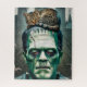 Una mesa gris se acurruca sobre la cabeza del monstruo de Frankenstein con un castillo al fondo.