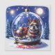 Kleine französische Bulldoggen im Schnee mit toller großer Weihnachtskugel. Die niedlichen Hunde wünschen Frohe Weihnachten und haben viele schöne Geschenke geschmückt mit tollen Schleifen dabei. Lustige , romantische Illustration mit Sternen und Mondschein zum Feiertag.