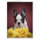 Frenchie - cachorro de bulldog francés con flores amarillas sobre fondo rojo
