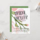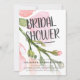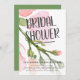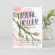 Una fresca y moderna ducha de novia con una gran rama floral de color rosa y verde agua, adornada con la frase "ducha de novia" con letras de pincel gris oscuro, y detalles del evento con una letra moderna. El reverso se encuentra en verde sólido, con un patrón de círculo superpuesto.