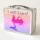 La imagen de la rana de colores vivos en esta caja de almuerzo se hizo a partir de una fotografía original de ZoeSPEAK de una ranita trepando por una ventana de vidrio. La rana es roja mezclándose en morado, luego azul. El fondo es amarillo pastel, pasando a rosa y después azul claro. Hay un texto que dice "¡Quiero almuerzo!". Esto está configurado para que usted lo personalize o elimine si lo prefiere.