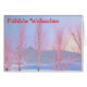 Un cuadro digital de pajaritas cubiertas de nieve; tintado de rosa por el sol. El texto en alemán "Frohliche Weihnachten" aparece en rojo. Aquí en el norte es común ver árboles cubiertos de nieve teñidos de rosa o naranja por el sol colgando bajo el horizonte.