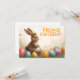 Ein niedlicher Osterhase mit einer Blumenkrone sitzt liebevoll inmitten bunter Ostereier. En Seinen Pfoten hält er ein kleines Weidenkörbchen mit bemalten Eiern. Die Szene ist von zarten Frühlingsblumen und cáliem Licht umgeben. Über dem Hasen leuchtet en fröhlichem Naranja die Aufschrift "Frohe Ostern"- ein herzlicher Gruß, der die Leichtigkeit und Freude des Frühlingsfestes einfängt.