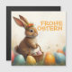 Ein niedlicher Osterhase mit einer Blumenkrone sitzt liebevoll inmitten bunter Ostereier. En Seinen Pfoten hält er ein kleines Weidenkörbchen mit bemalten Eiern. Die Szene ist von zarten Frühlingsblumen und cáliem Licht umgeben. Über dem Hasen leuchtet en fröhlichem Naranja die Aufschrift "Frohe Ostern"- ein herzlicher Gruß, der die Leichtigkeit und Freude des Frühlingsfestes einfängt.